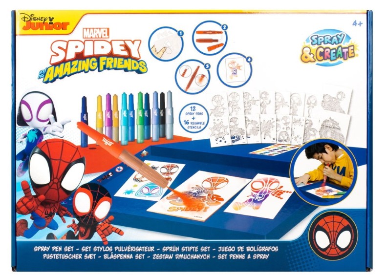Набор для создания красивых работ Spidey с помощью аэрозольных ручек. Включает в себя 16 трафаретов с Пауком и его классными друзьями, 12 аэрозольных ручек, подставку для ручек и 16 чистых листов. Не подходит для детей младше 3 лет.