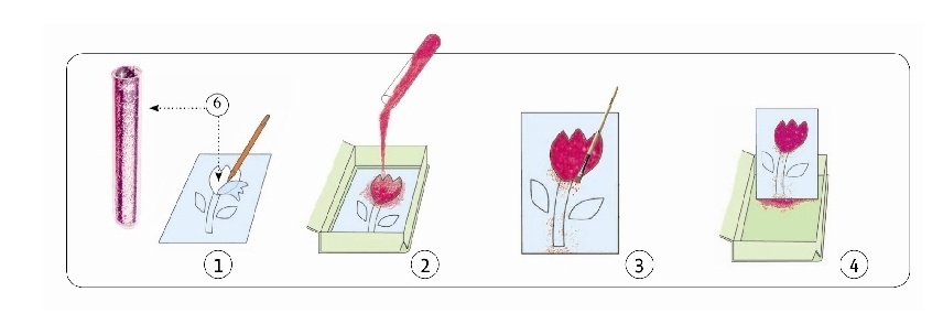 Комплектациячетыре картинки, пять тюбиков с блёстками разных цветов, кисточка, безопасный пинцет, пошаговое руководство