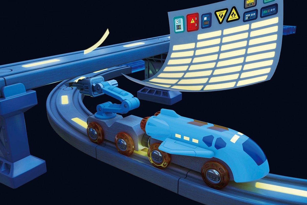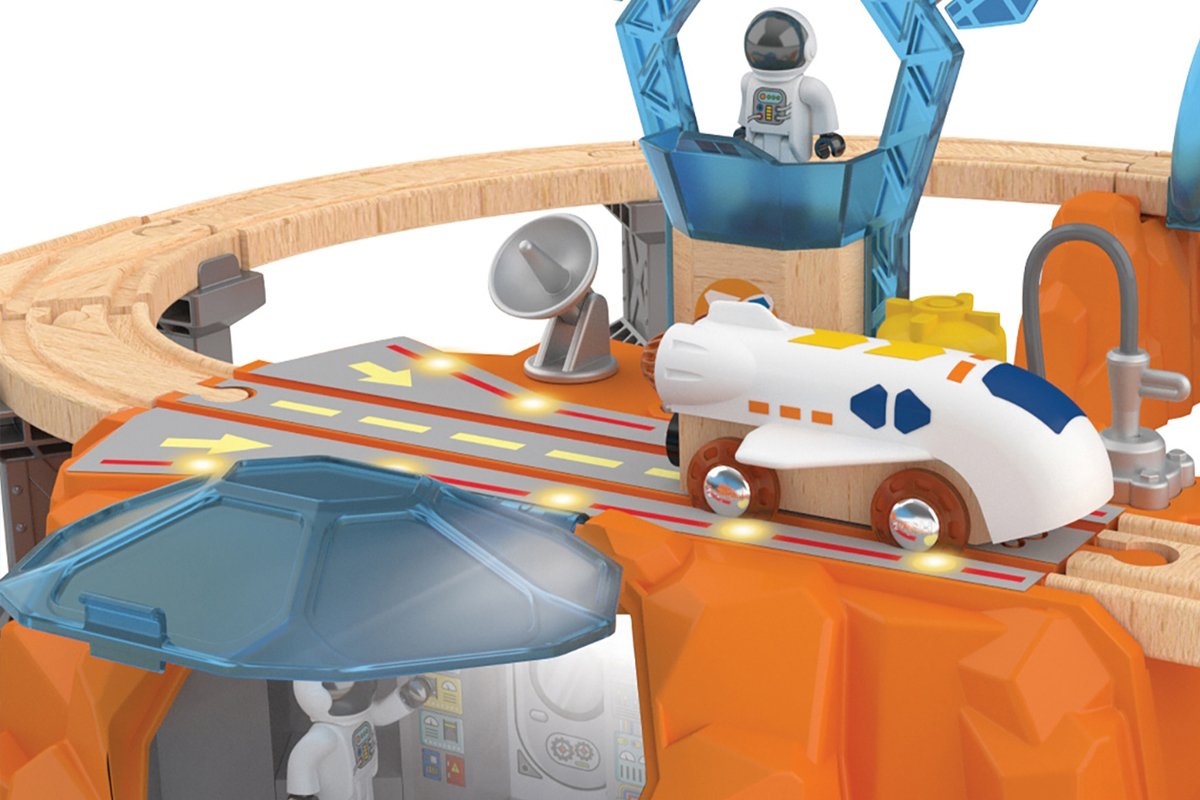 Есть ли жизнь на Марсе? Такой вопрос поставил себе храбрый исследователь из этого космического набора. Многоуровневый набор представляет из себя целую исследовательскую станцию по изучению космоса с несколькими локациями. Например, в секретной лаборатории изучается марсианский грунт, а мощные антенны передают сигнал на Землю с результатами исследований. Стационарный кран поднимает и опускает грузы с образцами грунта, а с обратной стороны лаборатории расположен гараж для космического транспорта. На крыше лаборатории есть взлетная площадка шаттла, на которой загораются взлетные огни, когда челнок взлетает или приземляется (для этого установите 3 батарейки ААА, не входят в комплект). Набор состоит из 48 элементов, среди которых есть деревянные и пластиковые рельсы разной формы и длины, космический челнок-шаттл, вездеход с космонавтом, грузовые вагончики, фигурки с грузом, подъемный кран, небольшие аксессуары и другие элементы дороги. Шаттл, вездеход и вагончики имеют классические магниты, поэтому они совместимы не только друг с другом, но и с локомотивами, аксессуарами и деревянной железной дорогой Hape и Brio. Чтобы сделать игровой процесс уникальным, используйте наклейки, которые входят в набор. Некоторые из них даже светятся в темноте! Набор просто создан для новых открытий, космических путешествий и изучения вселенной. Игрушка изготовлена из безопасных материалов, а краска не вызывает аллергии.