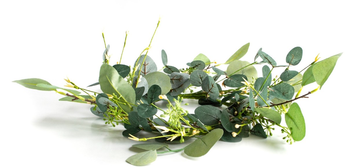 Венок Эвкалипт, диаметром 42 см – это изящное пластиковое растение, которое невозможно отличить от настоящего. Данные декоративные растения не выцветают и не вянут, неприхотливы к отсутствию освещения и к прямым солнечным лучам. Венок можно использовать для создания оригинального декора для витрины, офиса, гостиной или кухни. Этот декор придаст невероятную уютную атмосферу вашему дому.