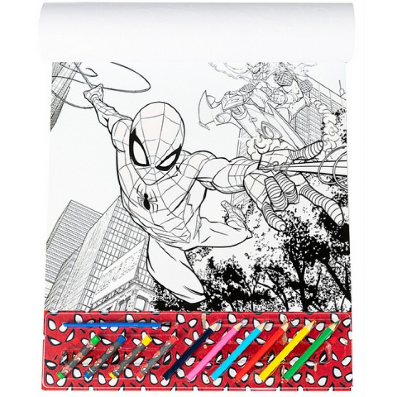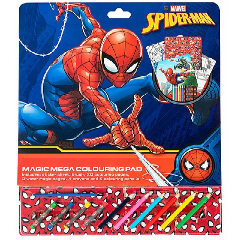 Большой набор волшебных рисунков «Человек-паук», состоящий из 20 листов для раскраски, 3 страниц для рисования водой, 4 цветных мелков, 6 цветных карандашей, наклеек и кисти А3.