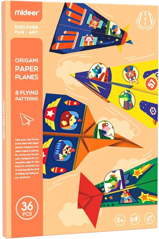 Mideer Оригами -Бумажные самолёты- это творческий набор, который объединяет искусство традиционного оригами с удовольствием создавать и запускать бумажные самолёты. Дети могут изучать техники складывания бумаги и создавать динамичные модели самолётов, развивая при этом координацию рук и глаз, воображение и пространственное мышление. Это увлекательная и познавательная деятельность, превращающая время игры в практический и творческий опыт.