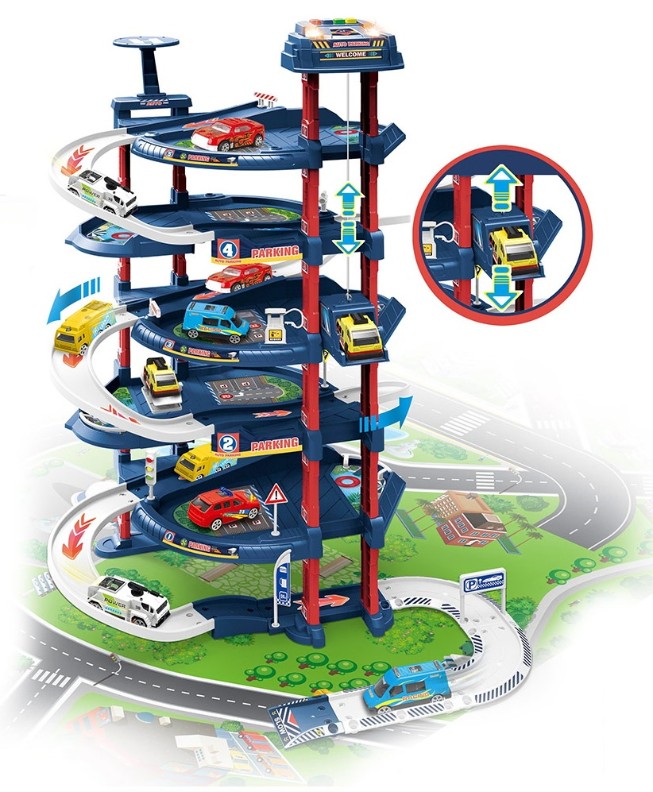 Сложный и интерактивный набор, созданный, чтобы предложить детям увлекательный игровой опыт. Комплекс представлял собой многоэтажный гараж и парковку с различными пандусами, взлетно-посадочными полосами и парковочными местами. В набор входит 82 элемента для создания полноценной игровой среды.