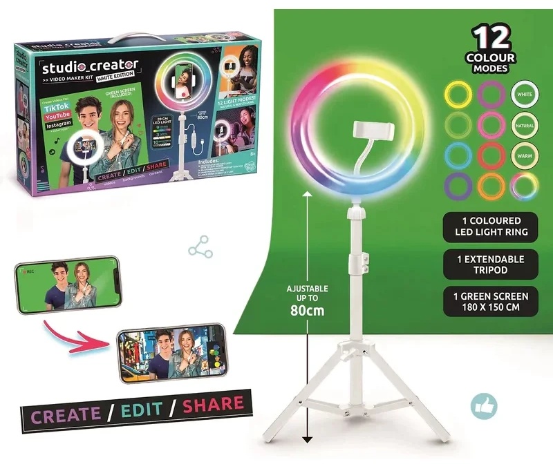 Создавайте потрясающие видеоролики как профессионал с помощью этого набора Studio Creator Maker! Красивое освещение и индивидуальный фон выведут ваши видео на новый уровень. Перейдите от зеленого экрана к фону по вашему выбору. Установите идеальное освещение и снимите себя на зеленом экране. Затем с помощью любимых приложений вы сможете вставить специальные фоны. Есть безграничные возможности выразить свое настроение, интересы и творчество с помощью видео!