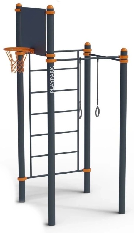 Комплектация: два разноуровневых Турника, Кольца, Щит баскетбольный с кольцом, Шведская лестница