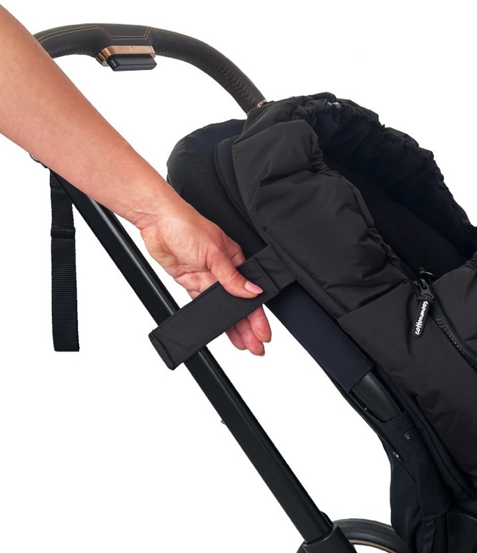 Зимний спальник MINI MOOSE PRIME имеет фирменные системы, предотвращающие смещение и соскальзывание спальника с коляски - противоскользящий коврик, стабилизирующий спальник в коляске, и две ленты-липучки, крепящиеся к ручкам коляски или ее спинке.