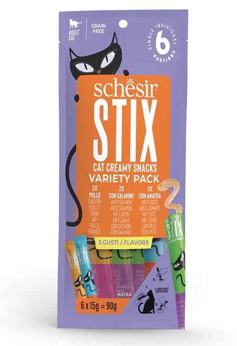 SHCHESIR STIX CAT POUCH Mixed flavors cream snack 6x15gr — кремовые лакомства в порционных пакетиках (6×15 г) с миксом вкусов: курица/ утка/ лосось. Идеально подходят для поощрения и укрепления связи с вашим питомцем. Легко подаются прямо из упаковки или в качестве добавки к основному корму.