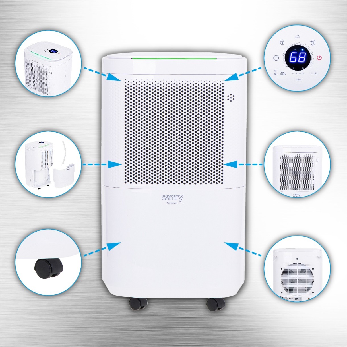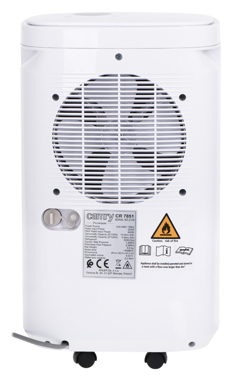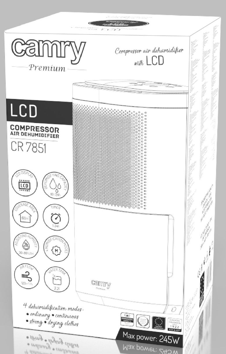 CR 7851 — это компрессорный осушитель воздуха с производительностью 10 литров воды в день и ЖК-дисплеем. В аппарате есть 4 режима сушки: нормальная, непрерывная, сильная и сушка одежды. Осушитель Он оснащен точным датчиком, показывающим текущий уровень влажности в помещении. После просушки помещения до ожидаемого уровня влажности устройство автоматически отключает компрессор, обеспечивая циркуляцию воздуха через вентилятор. Кроме того, осушитель оснащен индикатором влажности, показывающим уровень влажности на передней панели устройства с тремя цветами. Дополнительные преимущества продукта — функция родительской блокировки и гашения экрана.