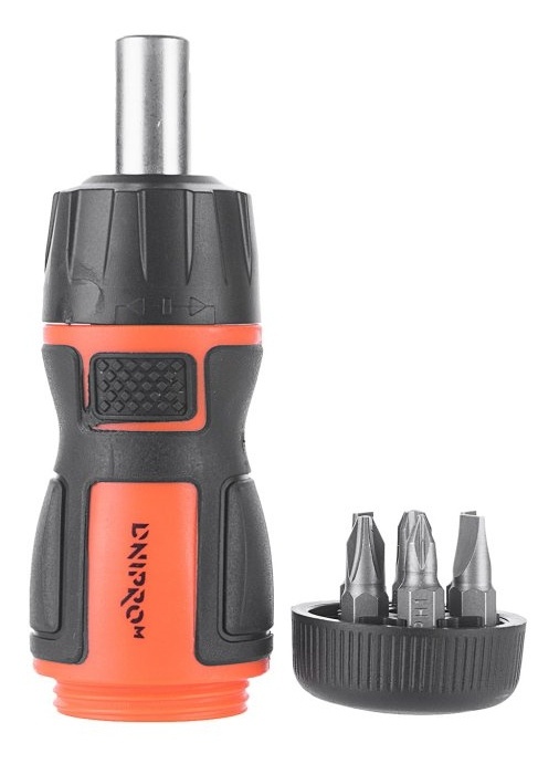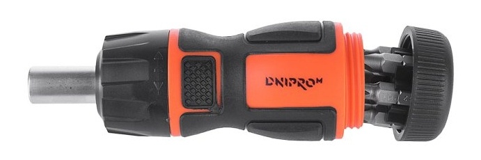 Реверсивная отвертка Dnipro-M изготовлена из стали марки S2, обладающей высокой прочностью. Каждая из семи магнитных насадок, которые хранятся в специальной полости отвертки, эффективно справляется с задачами по закручиванию крепежных элементов.