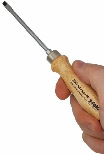 — Отвертка серии 330 с деревянной рукояткой имеет цельный стержень, который проходит по всей длине и содержит шестигранную гайку под ключ для дополнительного усилия.