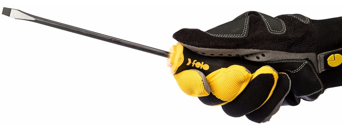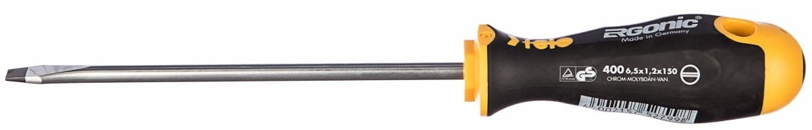 Плоская шлицевая отвертка 6,5×1,2×150 Felo Ergonic 40065510 служит для монтажных и демонтажных работ с резьбовыми соединениями, имеющими прямой шлиц. Инструмент имеет повышенную прочность и износоустойчивость. Его работая часть изготовлена из закаленной хром-молибден-ванадиевой стали. Для удобства и обеспечения точности работы стержень имеет черный наконечник. Запатентованная бесшовная рукоятка из трехкомпонентного пластика надежно ложится в ладонь пользователя и не скользит.