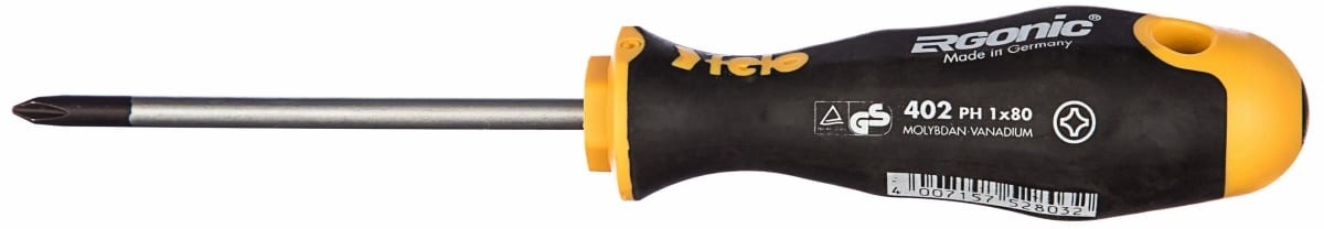 Крестовая отвертка PH 1X80 Felo Ergonic 40210210 — ручной инструмент для монтажно-демонтажных операций по обслуживанию резьбовых элементов. Рабочий профиль — PH. Стержень выполнен из прошедшей закалку хром-молибден-ванадиевой стали и отличается стойкостью к значительным нагрузкам. Рукоятка на имеет швов и изготовлена по запатентованной технологии ERGONIC. Она обладает способностью адаптироваться под руку пользователя и обеспечивает комфорт в работе.