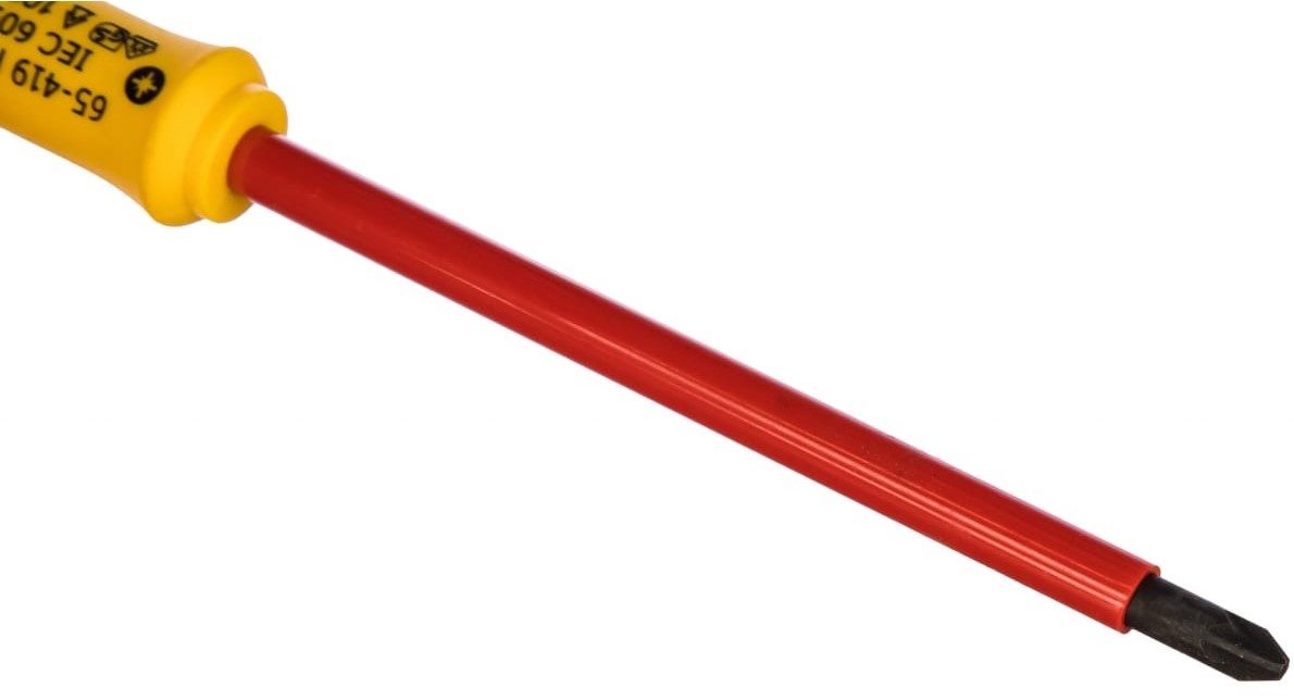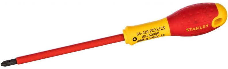 Диэлектрическая отвертка FATMAX 1000V PZ2×125 мм Stanley 0-65-419 предназначена для монтажа и демонтажа резьбовых соединений с шлицем Pozidriv, находящихся под напряжением до 1000 В.. Стержень изготовлен из стали и оснащен полиамидным изоляционным покрытием, которое защищает от износа, абразивных воздействий и влаги. Рукоять из двухкомпонентного материала не скользит в руке.