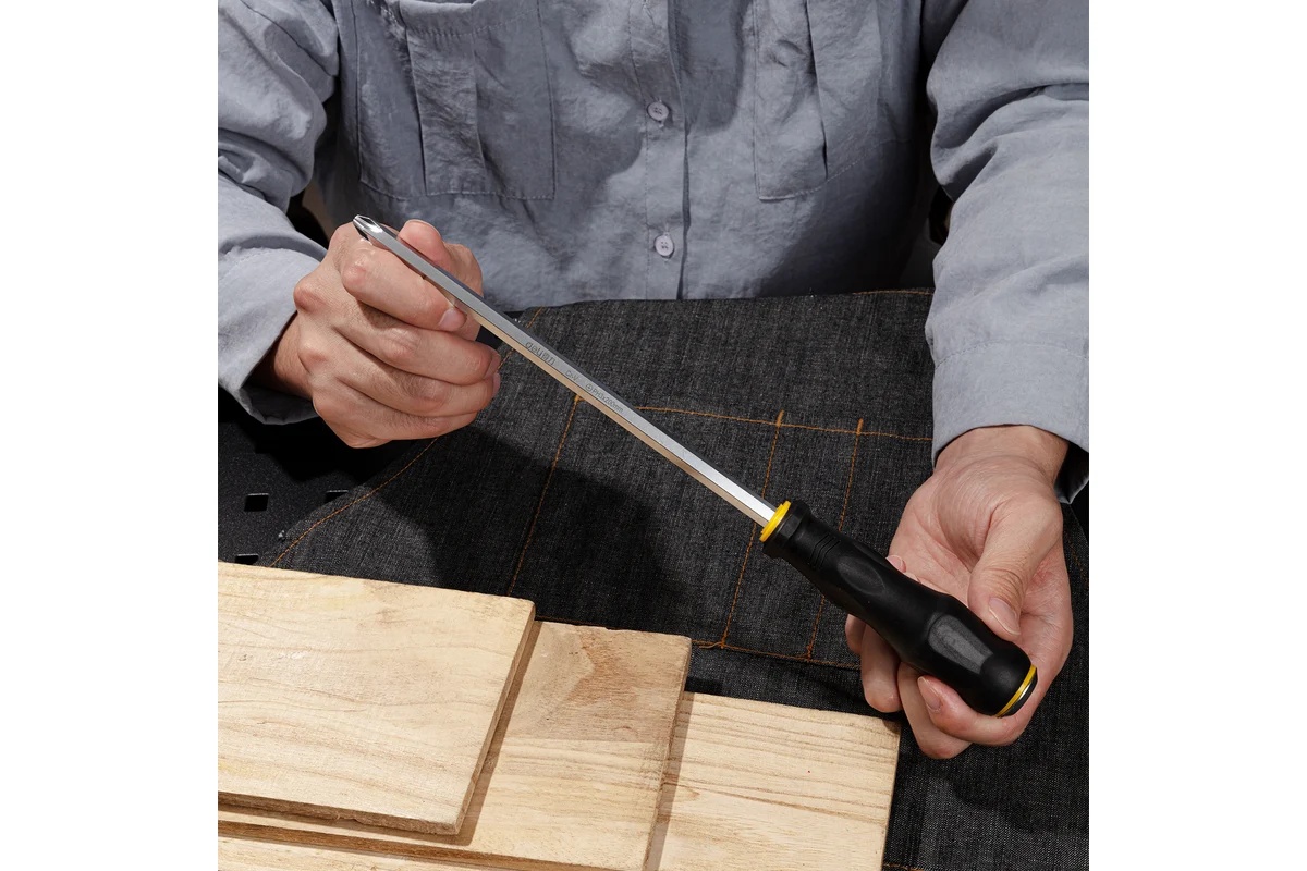 Ударная крестовая отвертка DELI DL627008 со сквозным хвостовиком, PH3x200 мм 104551 используется для работ с резьбовыми соединениями в процессе ремонта или монтажа. Металлический затыльник рукоятки позволяет использовать инструмент вместе с молотком в процессе откручивания сложных винтов и гаек. Стержень выполнен из качественной хромованадиевой стали, что обеспечивает высокую антикоррозийную стойкость и долговечность. Матовая поверхность жала исключает отражение от сильных источников света для удобства работы. Эргономичная рукоятка выполнена с учетом анатомических особенностей ладони, гарантируя продолжительную комфортную работу.