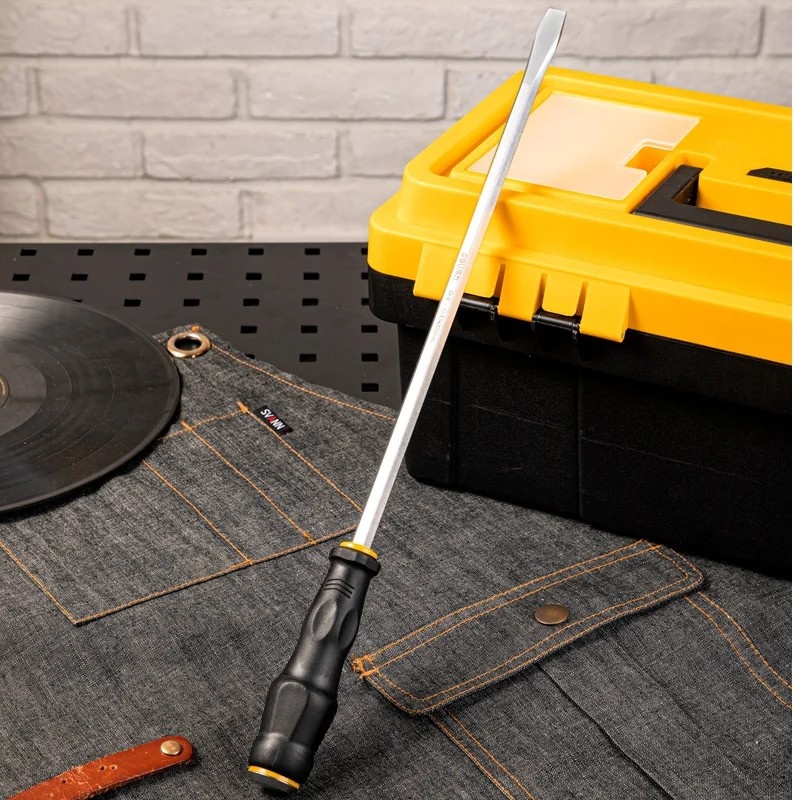 Ударная шлицевая отвертка DELI DL6270101 со сквозным хвостовиком, SL8x250 мм 104564 используется для работ с резьбовыми соединениями в процессе ремонта или монтажа. Металлический затыльник рукоятки позволяет использовать инструмент вместе с молотком в процессе откручивания сложных винтов и гаек. Стержень выполнен из качественной хромованадиевой стали, что обеспечивает высокую антикоррозийную стойкость и долговечность. Матовая поверхность жала исключает отражение от сильных источников света для удобства работы. Эргономичная рукоятка выполнена с учетом анатомических особенностей ладони, гарантируя продолжительную комфортную работу.