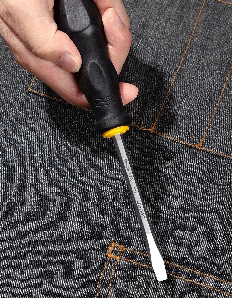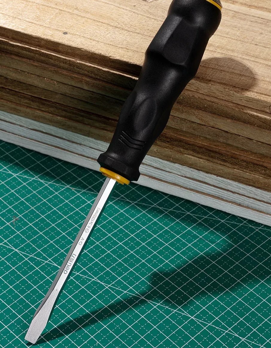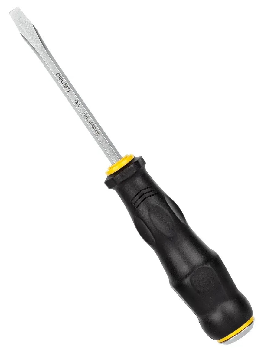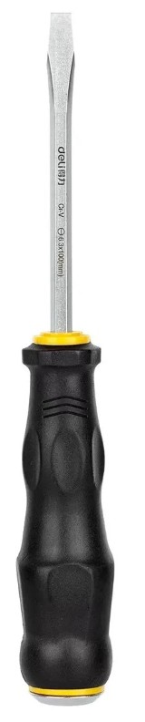 Ударная шлицевая отвертка DELI со сквозным хвостовиком, SL6x100 мм используется для работ с резьбовыми соединениями в процессе ремонта или монтажа. Металлический затыльник рукоятки позволяет использовать инструмент вместе с молотком в процессе откручивания сложных винтов и гаек. Стержень выполнен из качественной хромованадиевой стали, что обеспечивает высокую антикоррозийную стойкость и долговечность. Матовая поверхность жала исключает отражение от сильных источников света для удобства работы. Эргономичная рукоятка выполнена с учетом анатомических особенностей ладони, гарантируя продолжительную комфортную работу.