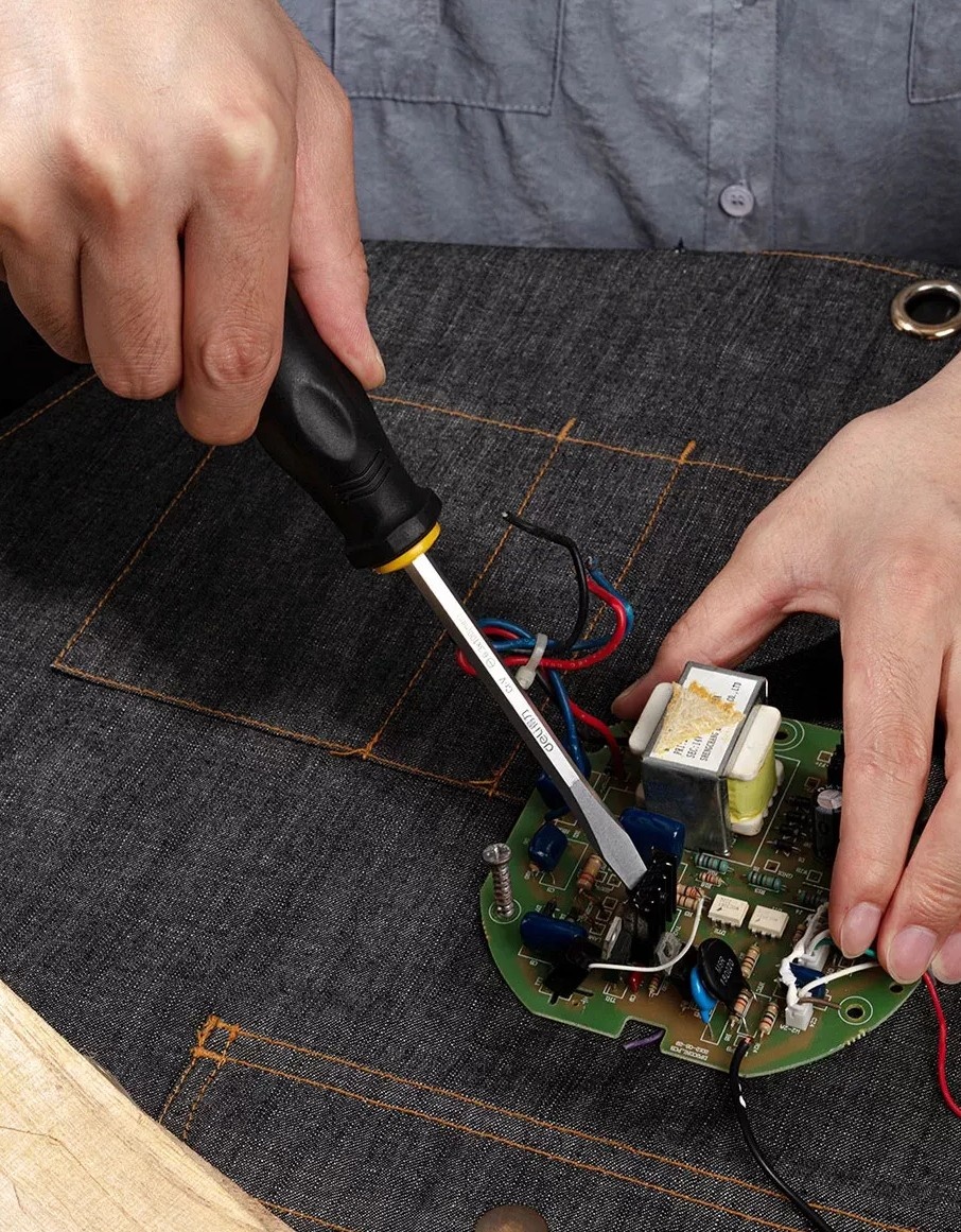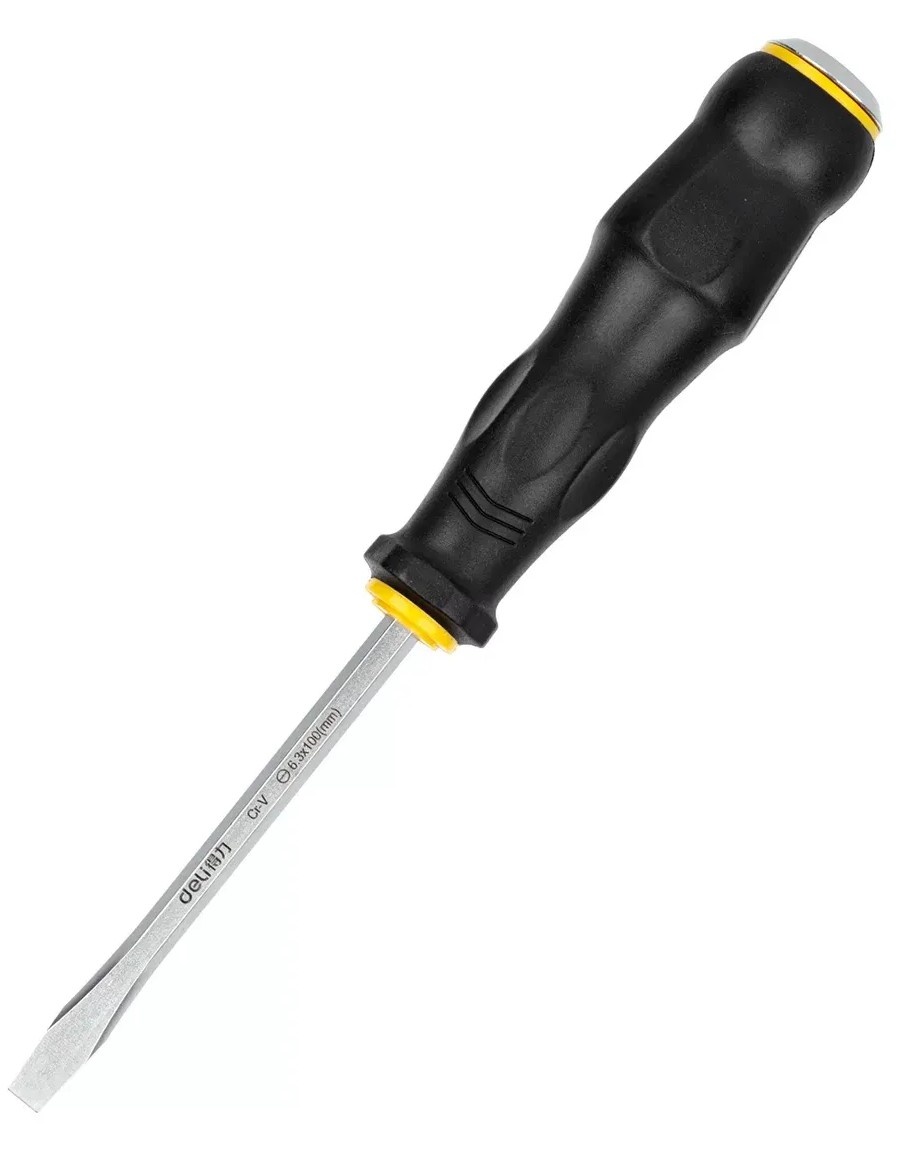 Ударная шлицевая отвертка DELI со сквозным хвостовиком, SL6x150 мм используется для работ с резьбовыми соединениями в процессе ремонта или монтажа. Металлический затыльник рукоятки позволяет использовать инструмент вместе с молотком в процессе откручивания сложных винтов и гаек. Стержень выполнен из качественной хромованадиевой стали, что обеспечивает высокую антикоррозийную стойкость и долговечность. Матовая поверхность жала исключает отражение от сильных источников света для удобства работы. Эргономичная рукоятка выполнена с учетом анатомических особенностей ладони, гарантируя продолжительную комфортную работу.