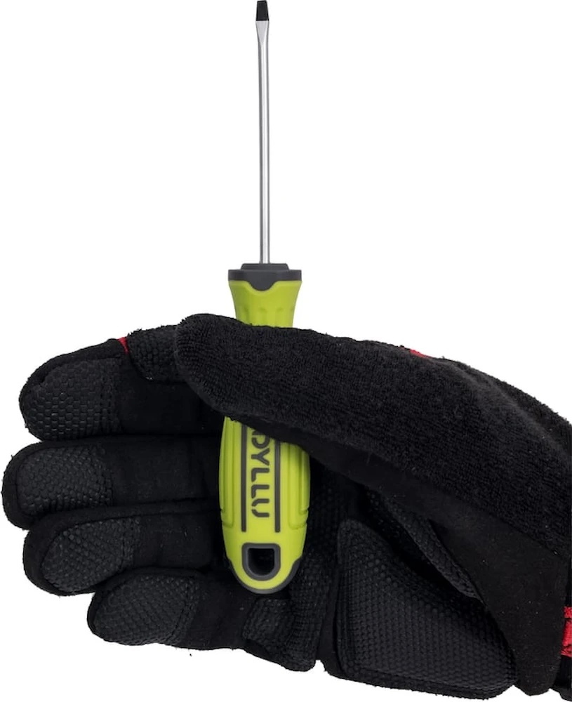 Компактная плоская отвертка с наконечником SL4 и лезвием длиной 100 мм станет надежным помощником для точных работ. Лезвие изготовлено из высококачественной стали Cr-V с черным кончиком, что обеспечивает устойчивость к коррозии и механическим нагрузкам. Круглый хвостовик гарантирует прочное соединение с ручкой, а намагниченный наконечник удерживает винты в нужном положении. Удобная ручка с мягкой накладкой снижает нагрузку на руки, делая процесс работы максимально комфортным.