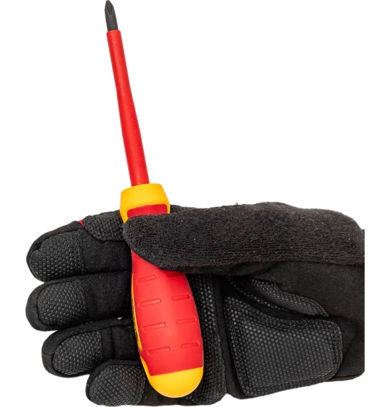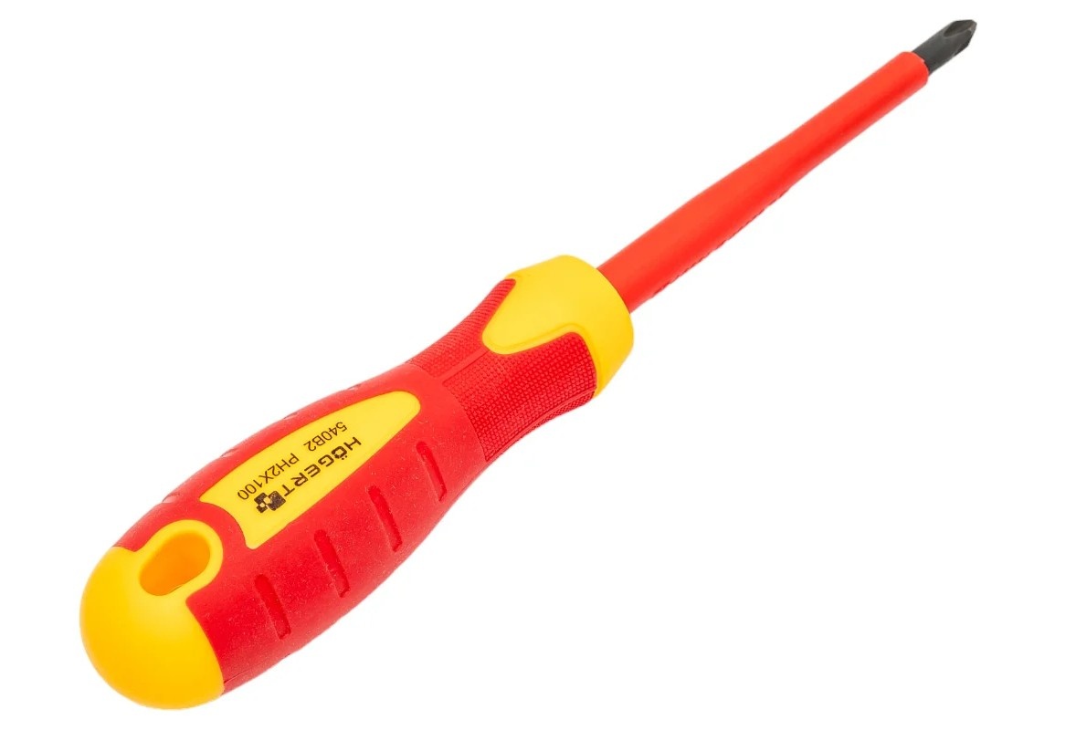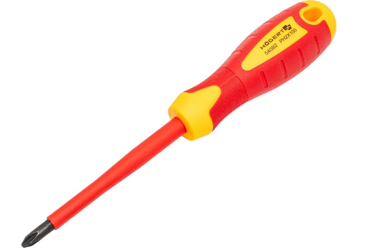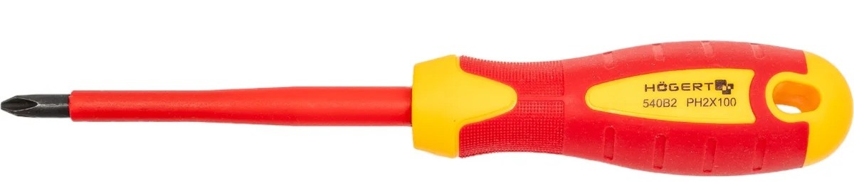 Изолированная крестовая отвертка HOEGERT TECHNIK PH2, 100 мм, 1000 V, сталь S2 HT1S924 оснащена высокопрочным стержнем из легированной стали. Он устойчив к истиранию, не деформируется при силовом вращении. Надежно закреплен в рукоятке.Слой защитной изоляции обеспечивает полноценную защиту от пробоя. Позволяет работать в сетях под напряжением.