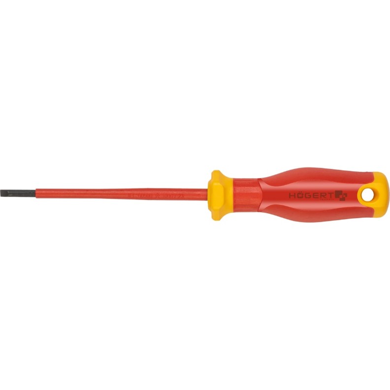 Отвертка диэлектрическая Hoegert HT1S961 1000V - рассчитана на профессиональное применение с винтами и шурупами с прямым шлицем (SL). Соответствует стандарту EN 60900. Сертификат VDE 1000 V. Изготовлена из высококачественной легированной стали CrMo. Предназначена для длительной непрерывной работы и больших нагрузок. Изолированный намагниченный стержень защищает руки от контакта с металлом и увеличивает удобство работы.