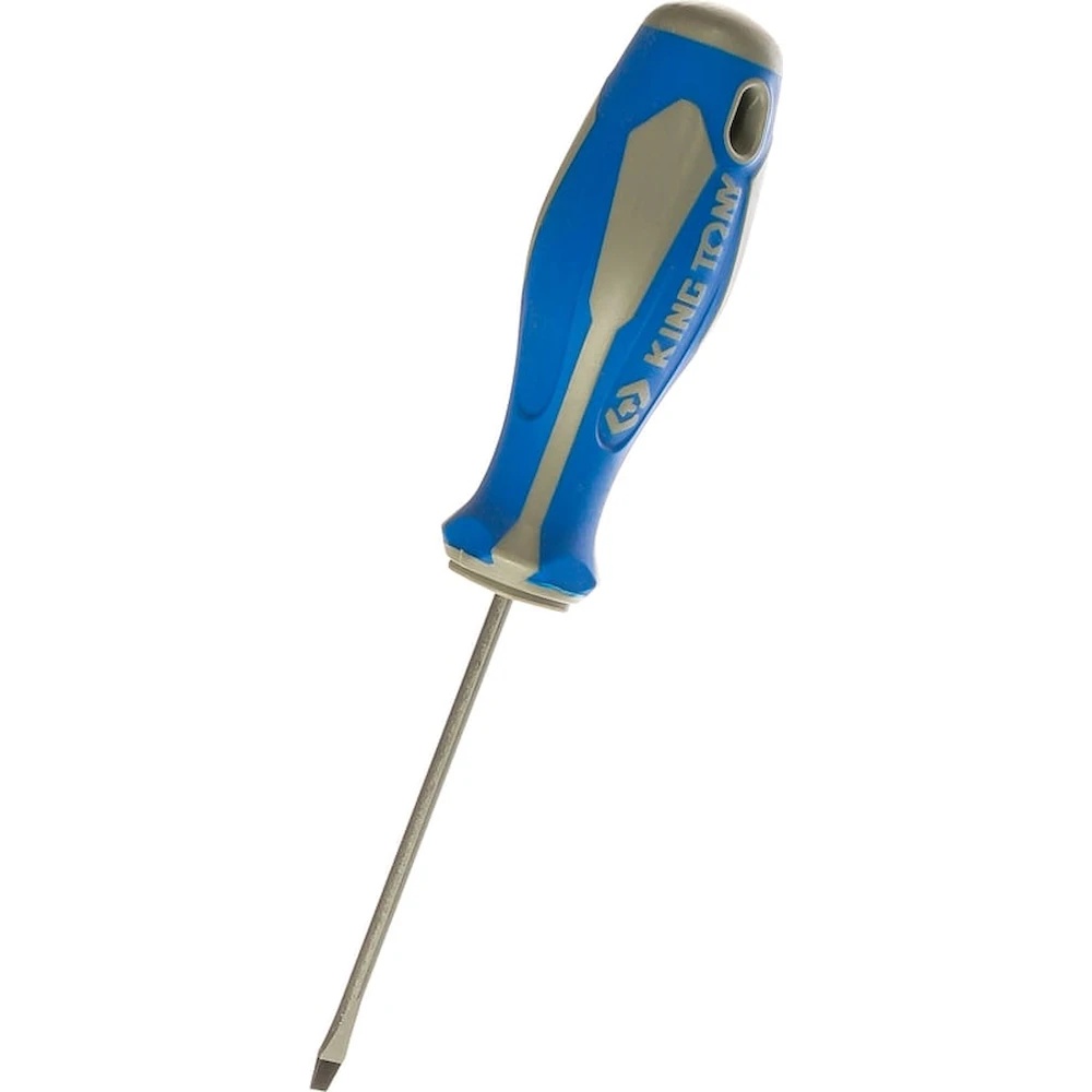 Шлицевая отвертка Slotted 3.0мм, 75мм KING TONY 14220303 представляет собой сочетание стального стержня с вороненым наконечником и удобной двухкомпонентной рукоятки. Инструмент предназначен для завинчивания/отвинчивания крепежных элементов вручную, имеющих плоский внутренний рабочий профиль.