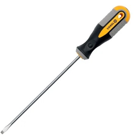 Ручной слесарный инструмент, предназначенный для завинчивания и отвинчивания крепёжа с резьбой, на головке которого имеется шлицевой паз. Наконечник отвёртки может изнашиваться из-за значительного механического напряжения в процессе работы, поэтому для увеличения срока службы наконечника, его изготавливают из специальных износостойких и прочных сплавов. Эргономичная рукоятка выполнена из трех современных технологичных материалов, которые предотвращают проскальзывание руки, что снижает усталость оператора и обеспечивает более эффективную работу. Незаменима в наборах инструмента, в автомобиле, при проведении ремонта в квартире.
