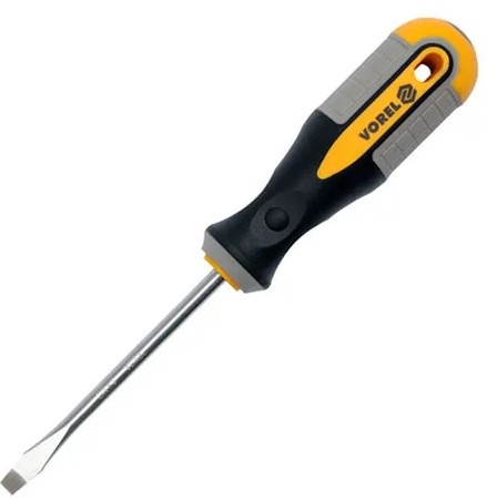 Отвертка марки "Vorel" изготовлена из хром-ванадиевой стали CrV. Наконечник отвёртки изготовлен из специальных износостойких и прочных сплавов, а также намагничен, что обеспечивает надежное сцепление с головкой винта. Эргономичная рукоятка выполнена из двух современных технологичных материалов, которые предотвращают проскальзывание руки, что снижает усталость оператора и обеспечивает более эффективную работу. Отверстие в рукоятке позволяет подвешивать отвертку.