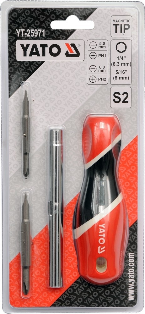 Отвертка YATO YT-25971 - Комбинированная двухсторонняя отвертка применяется для монтажа или демонтажа саморезов и другого вида крепежа с прямым и крестовым пазом. Отвертка оснащена хромированным стержнем и магнитным держателем для бит. Эргономичная рукоятка выполнена из трех современных технологичных материалов, которые предотвращают проскальзывание руки, что снижает усталость оператора и обеспечивает более эффективную работу.