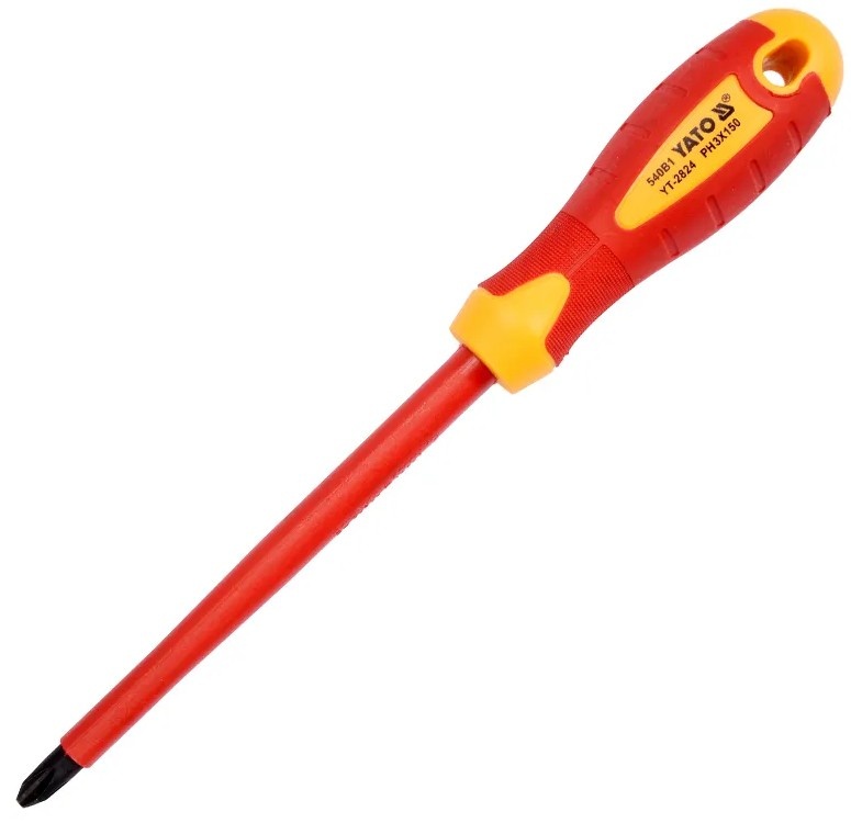 Отвёртка диэлектрическая YATO YT-2824 PH3 x 150 мм. - Отвёртка крестовая диэлектрическая применяется при работах с резьбовыми соединениями, находящимися под электрическим напряжением. Отвертка имеет 1000В защиту, что позволяет работать с конструкциями под напряжением. Благодаря эргономичной форме рукоятки снижается усталость при длительной работе.