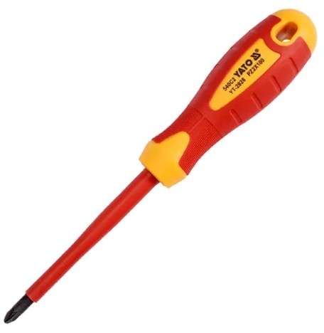 Отвёртка YATO YT-2826 PZ2 x 100 мм. - Отвёртка крестовая диэлектрическая применяется при работах с резьбовыми соединениями, находящимися под электрическим напряжением. Стержень отвертки выполнен из инструментальной стали. Отвертка имеет 1000В защиту, что позволяет работать с конструкциями под напряжением. Благодаря эргономичной форме рукоятки снижается усталость при длительной работе.