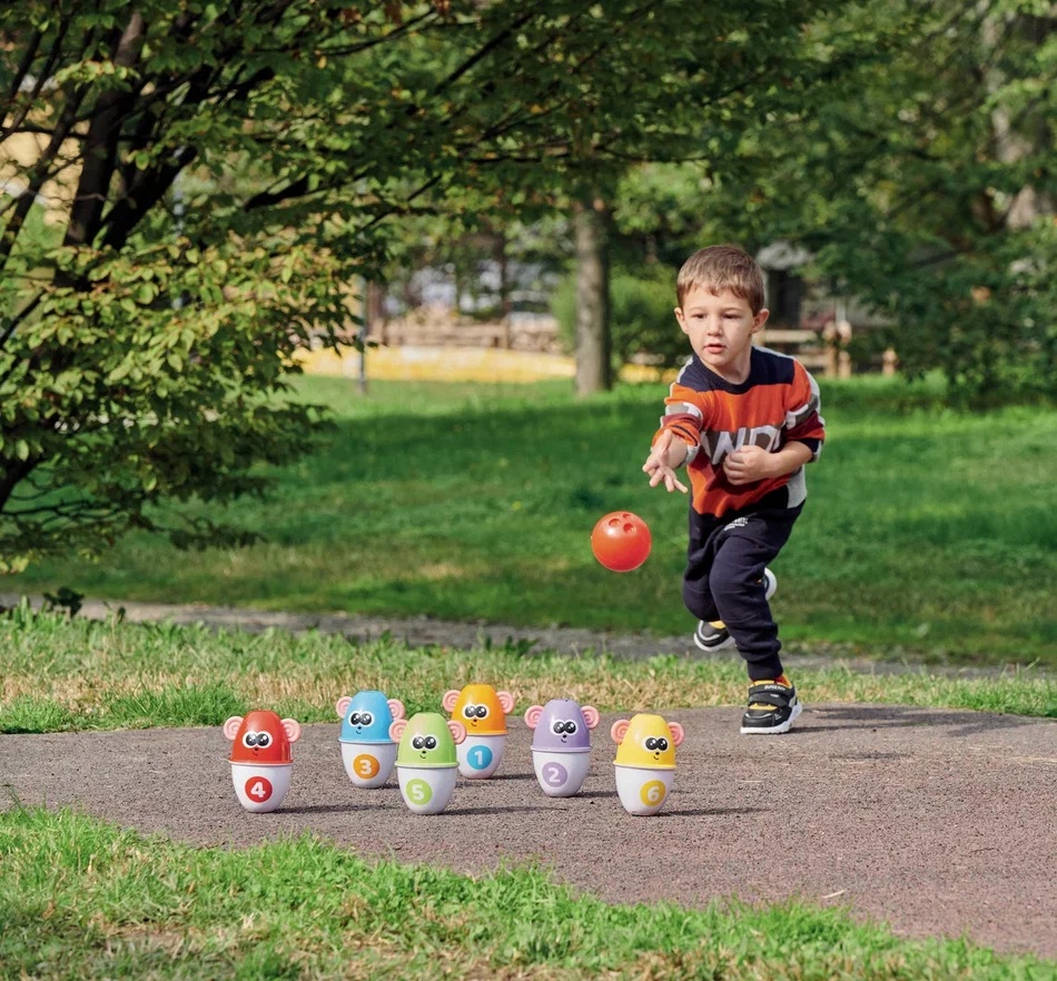 Детский игровой набор для подвижных игр Chicco Боулинг подарит вашему ребенку массу положительных эмоций. В него будет весело играть как дома, так и на свежем воздухе. Набор включает в себя кегли в виде обезьянок разных цветов и шар с углублениями для пальчиков. Необходимо расставить кегли и сбить как можно больше, запустив шар. Кегли состоят из двух частей. Их можно разъединить и создавать различные комбинации - поставить обезьянок друг на друга, выстроить пирамидку или башню. Ваш ребенок с удовольствием будет играть в боулинг, развивая ловкость, меткость и координацию движений.