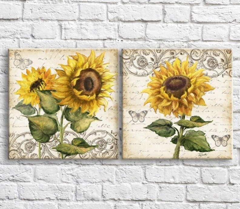 Картина ArtPoster Yellow sunflowers and butterflies in oil on the background of text and patterns, diptych (3467716)