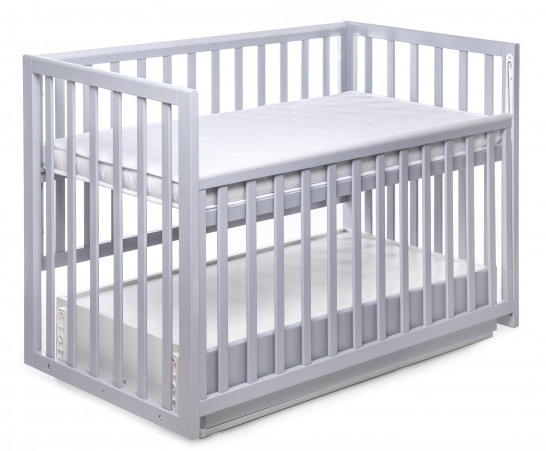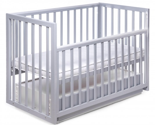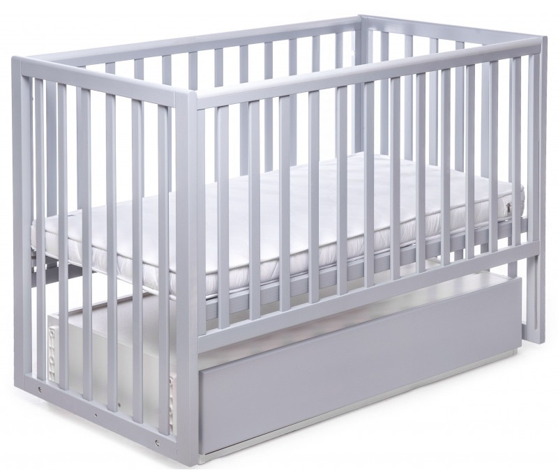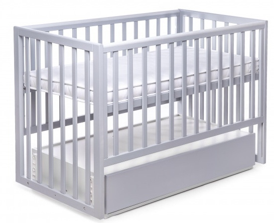 Кроватка имеет маятниковый механизм поперечного качания с фиксатором, а также возможность опускания бортика. Высоту спального места можно регулировать на двух уровнях. Все детали имеют безопасные округлые формы, а также бортики с накладками-грызунками. Комплектуется кровать закрытым, двухкамерным ящиком для хранения детских вещей (ящик изготовлен из высококачественного сертифицированного ДСП).
