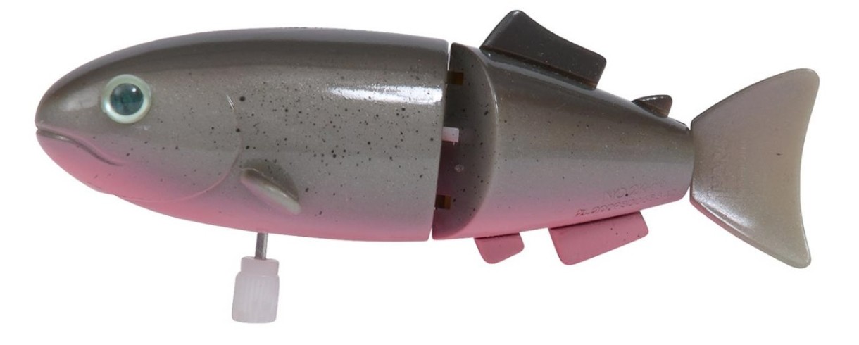 Заводной пластиковый лосось с блестящей и разноцветной чешуей! Сочлененный из трех частей, просто поверните заводной механизм, чтобы увидеть, как он ковыляет по океану (или просто по вашей ванне...)!