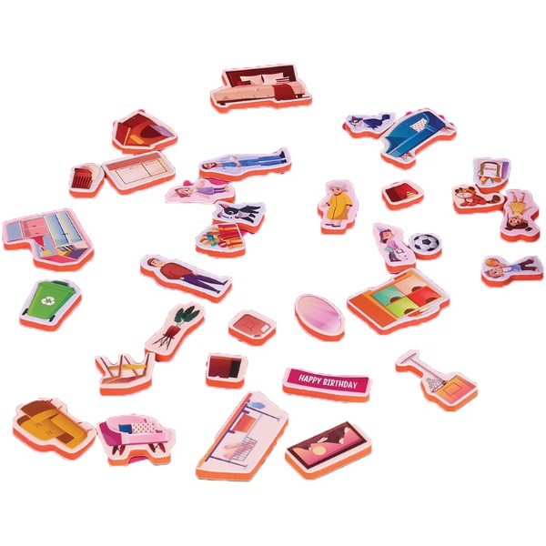 Размещайте и перемещайте различные электроприборы, столы, диваны, мебель, игрушки, декоративные предметы в каждой комнате и создавайте различные концепции в соответствии с вашим воображением. С героями семьи, оформленными в декоре, можно придумать тысячи историй. Благодаря специальной магнитной доске можно играть с удовольствием даже в длительных путешествиях. Помимо украшенной доски, игра может использоваться на металлических поверхностях, таких как холодильники.