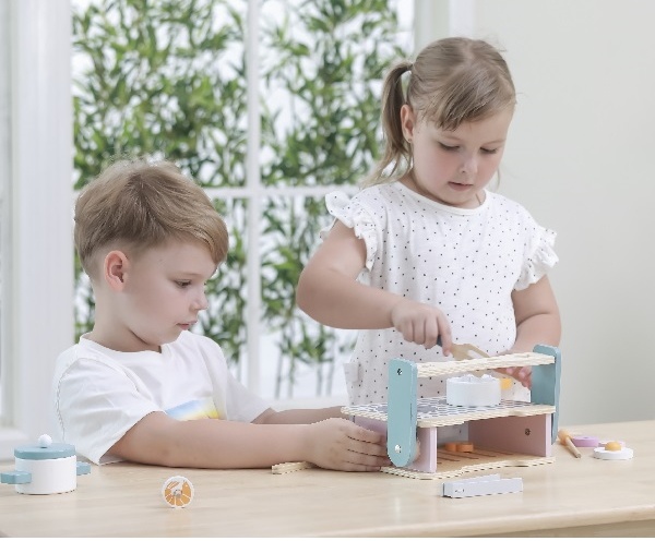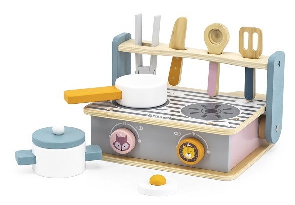 Развивающая деревянная игрушка выполнена в пастельных оттенках, как и вся серия PolarB. Мягкие цвета и стильные узоры на игрушечной кухне отлично впишутся в интерьер детской комнаты.