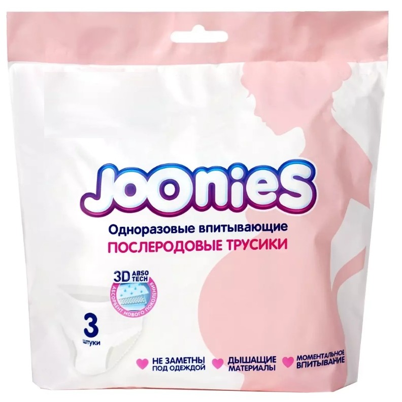 Послеродовые одноразовые трусики Joonies удобно использовать в роддоме - не нужно покупать отдельно сетчатые трусики и впитывающую прокладку, их удобно снимать, разорвав по боковому шву. Послеродовые одноразовые трусики Joonies похожи на обычные трусики – тонкие, «дышащие», и при этом отлично впитывают. Послеродовые трусики Joonies можно использовать при любых обильных выделениях и не только в роддоме, ночью для спокойного сна и даже днем, потому что они такие тонкие, что не заметны под одеждой. В послеродовых трусиках Joonies используется высокотехнологичный абсорбент, который впитывает большой объем жидкости и не разбухает.