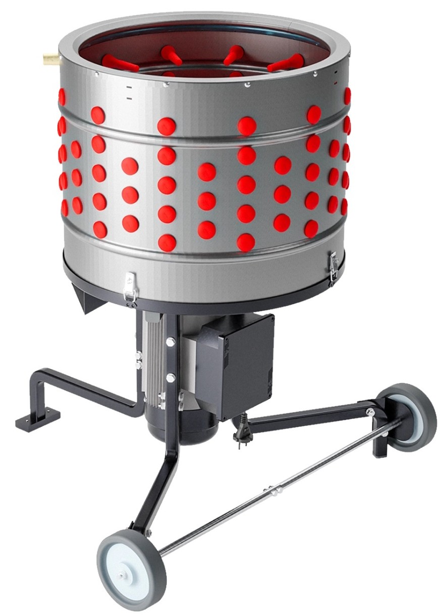Птица обрабатывается в широком цилиндрическом барабане, оснащенном вращающимся диском. На диске и стенках барабана установлены несколько рядов резиновых пальцев (EU PROFI A), которые обеспечивают быстрое и эффективное удаление перьев.