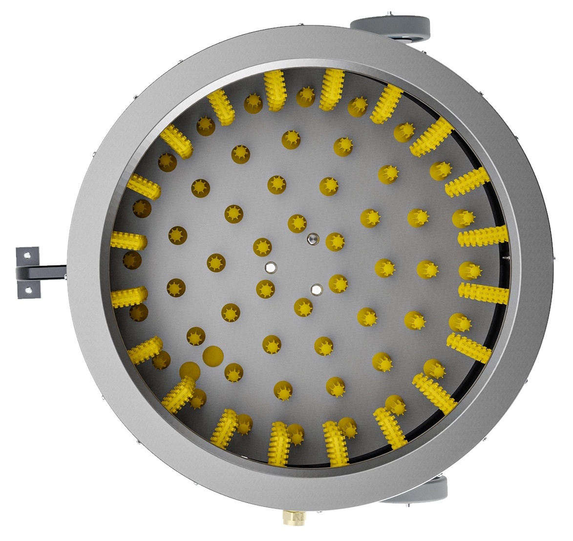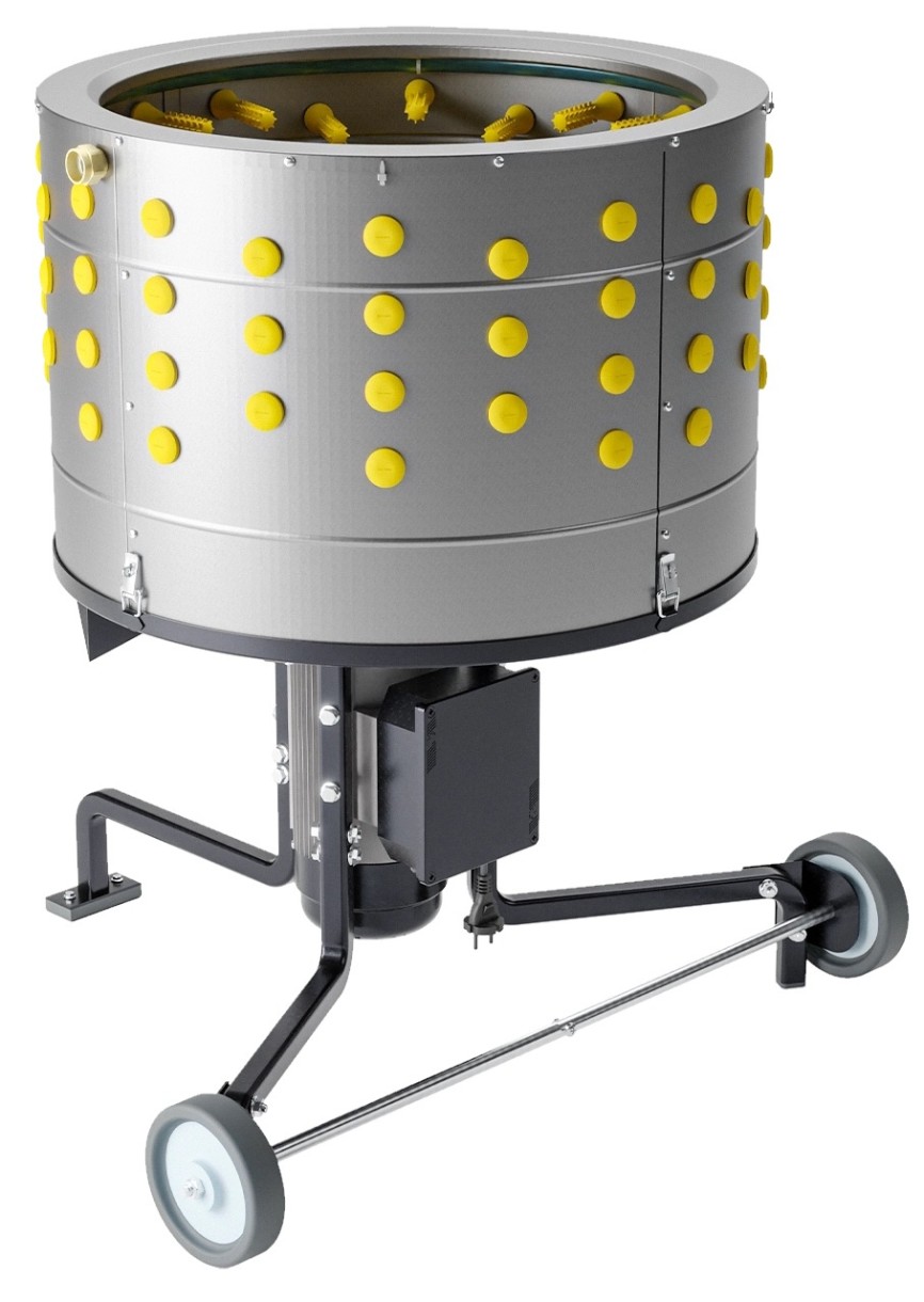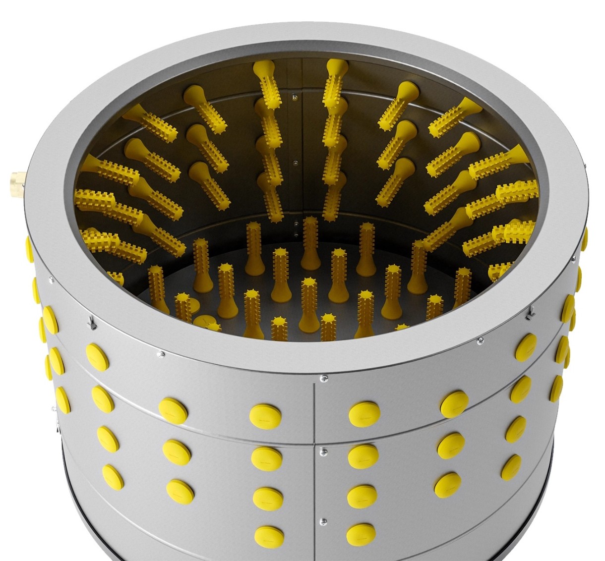 Птица обрабатывается в широком цилиндрическом барабане, оснащенном вращающимся диском. На диске и стенках барабана установлены несколько рядов резиновых пальцев (EU PROFI A), которые обеспечивают быстрое и эффективное удаление перьев.