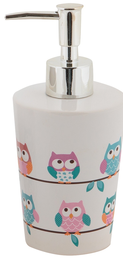 Набор аксессуаров в ванную комнату Сова . Набор выполнен в ярких тонах и изготовлен из керамики. Упакован в презентабельную упаковку. В набор входит 3 предмета : дозатор, мыльница и стакан для зубных щёток.