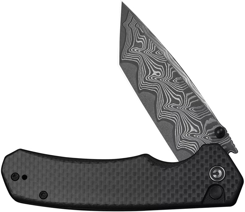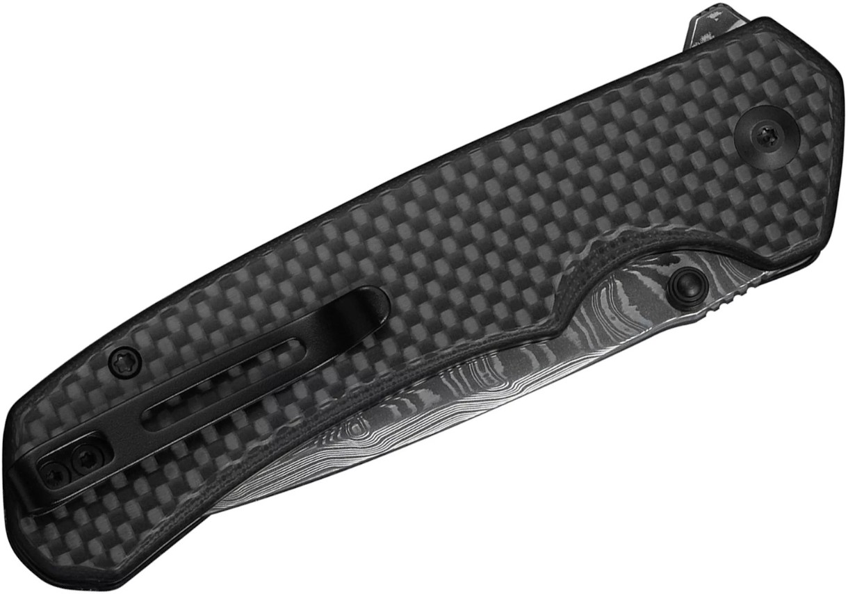 Рукоять выполнена из комбинации карбонового волокна и G10, что обеспечивает лёгкость, прочность и уверенный хват.