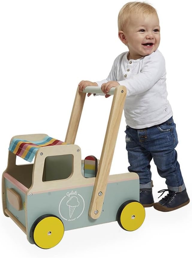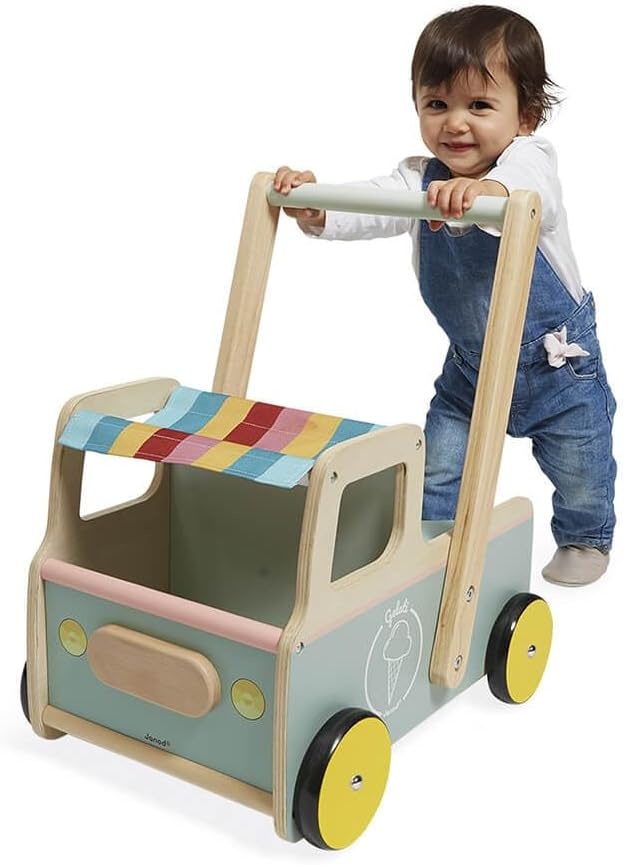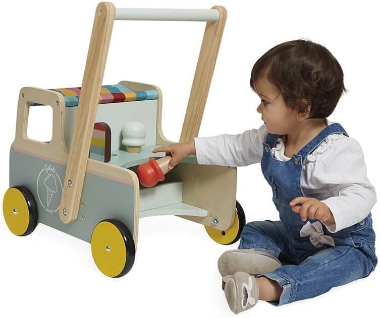 Удобно, когда можно взять на прогулку приятного друга, не правда ли? Эта игрушка для раннего развития, оснащенная бесшумными колесами, представляет собой игрушку 2 в 1: идеально подходит для того, чтобы помочь ребенку научиться ходить, а также является игрушкой-имитатором, которая позволяет ему представить себя маленьким уличным торговцем! Детям от 1 года можно будет предлагать изготовить мороженое в течение дня — хороший способ пообщаться и поделиться вкусными моментами.