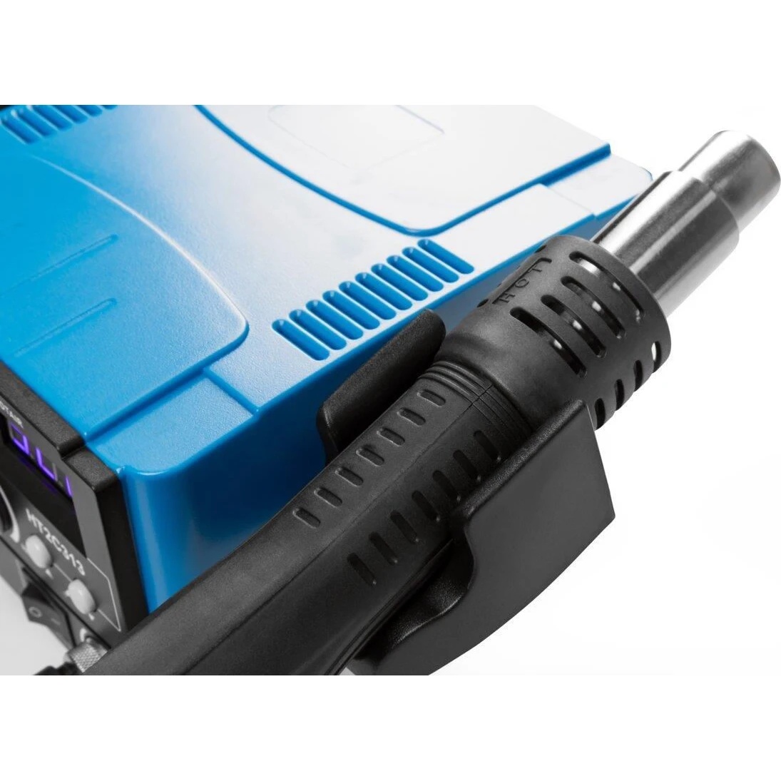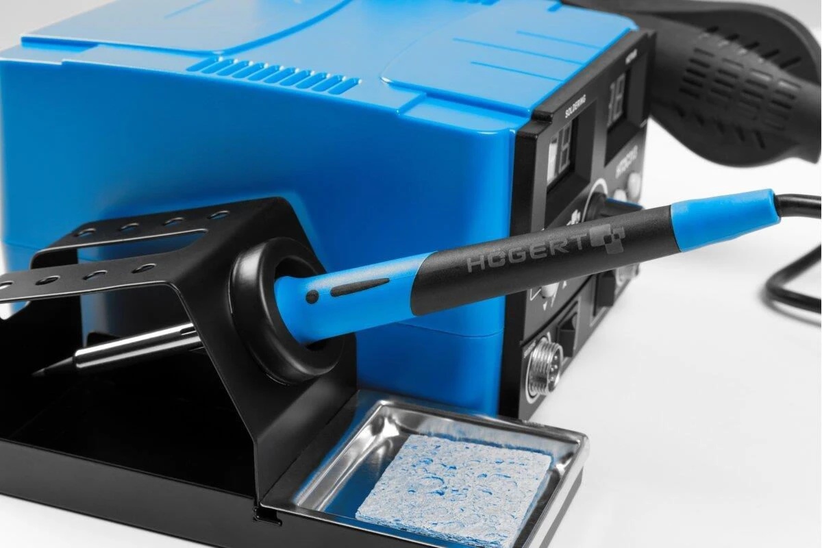 Högert HT2C313 — это профессиональная цифровая паяльная станция «2 в 1», совмещающая классический контактный паяльник и термофен для работы с горячим воздухом. Устройство предназначено для точной пайки и выпайки SMD и BGA компонентов в сервисных центрах и мастерских.