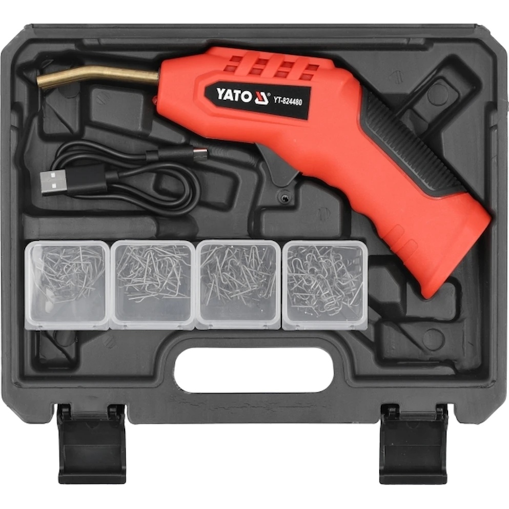 Маленький, беспроводной и удобный пластиковый сварочный аппарат YATO YT-824480. Нагревает не менее 60 скоб на максимальных параметрах за одну зарядку. Работает в трех режимах: до 400 °C (I-L), 500 °C (II-M) и 600 °C (III-H).Он нагревает скобы специальной формы, которые вплавляются в пластик, чтобы соединить и укрепить трещину. Затем, как и в случае с автомобильными крыльями, трещина дополнительно обрабатывается, например, из-за нанесения шпатлевки.