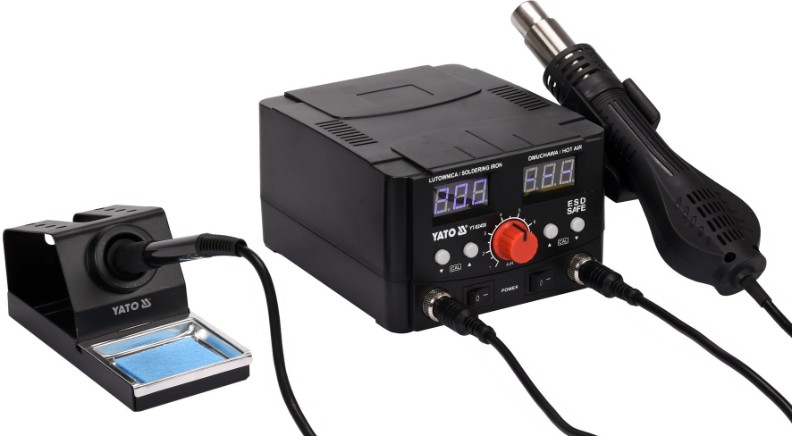 Паяльная станция 2-в-1 с символом YT-82458 с двойным светодиодным цифровым дисплеем, контролем температуры и множеством функций, облегчающих правильную пайку соединений. Станция поддерживает паяльник 908D, адаптированный к очень популярным сменным жалам серии 900M, и ручку HOT-AIR с обдувом от бесщеточного вентилятора.