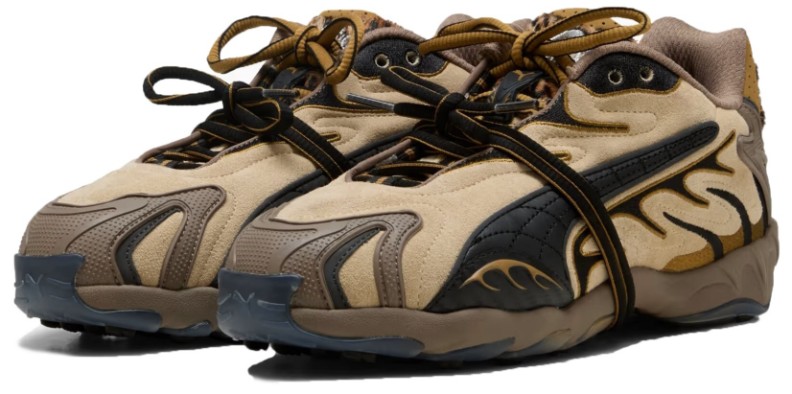 Верх выполнен из замши с синтетическими накладками и текстильными вышивками, создающими сложную многослойную структуру. Эффектные вставки из меха с леопардовым принтом на язычке и пятке придают модели выразительность и индивидуальность. Двухслойная вышивка в виде пламени добавляет динамики и подчёркивает энергичный стиль коллаборации.