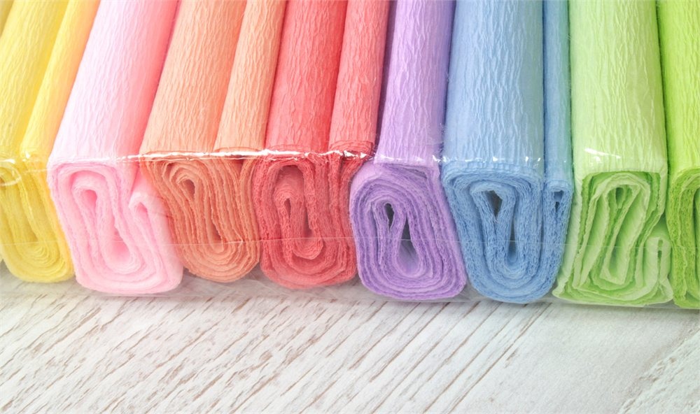 Креповая бумага пастельных тонов. Набор из 10 цветов. Формат — 200 см x 50 см. Упаковка — прозрачный полиэтелен.