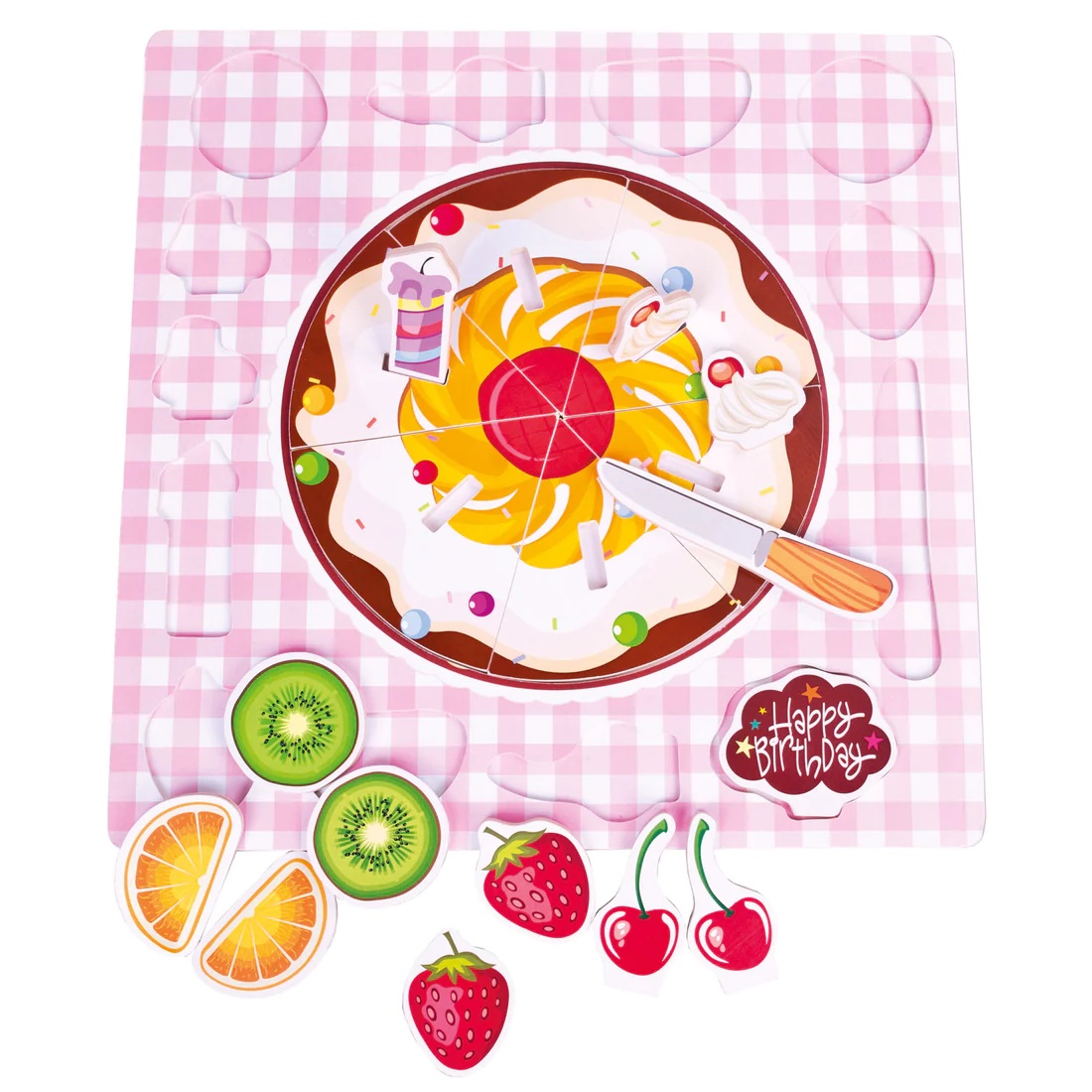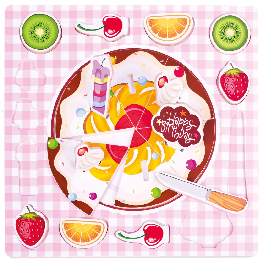 Деревянная головоломка, праздничный торт. Ингредиенты для торта можно просто положить на поверхность или в специальные отверстия. В набор входит деревянный нож и табличка «С днем рождения».