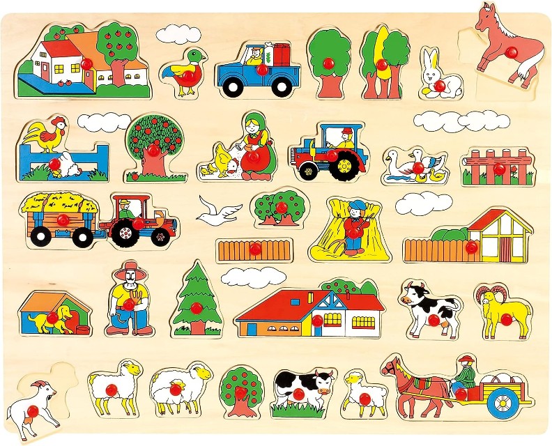 Большой пазл-вставка с сельскохозяйственными животными. Узнайте о распорядке дня разных животных, о том, какие сельскохозяйственные постройки служат какой цели в игровой форме, используя 31 элемент головоломки. Тренируйте мелкую моторику и технику захвата. Детали пазла снабжены небольшими пластиковыми заглушками, которые помогут вашему ребенку хватать животных и манипулировать ими. Изготовлен из фанеры.