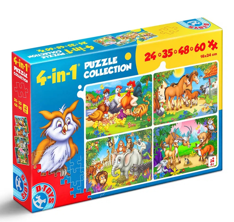 Коллекция содержит 4 пазла по 24, 35, 48 и 60 деталей, изображающих домашних животных. Соберите детали пазла, чтобы воссоздать сценки с этими милыми зверятами!